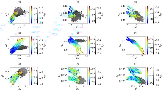 In the second row, Figure 5e–g, the threshold dB has been applied to classify the solutions, showing the proportional distributions of , and , respectively. The blue and orange bars represent the proportion of apertures that generate beampatterns whose value are less and greater than the threshold value , respectively, and the black line represents the distribution of binned arrays related to the calculated statistical parameters. From this value, the value can oscillate in a range of 2.5 dB. It can be seen that the presence of good apertures increases with low values of variance and high area (up to 20%). Although it seems to be a trend that the number of good apertures increases for low kurtosis values, it has less significance.