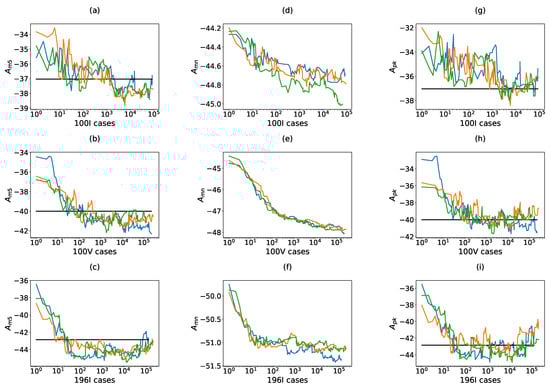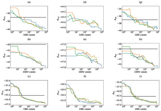 Figure 9 illustrates the evolution of better results found for three searches per configuration, where , and (columns) are analyzed for the 100I, 100V and 196I configurations (rows). In the figures corresponding to and , a horizontal line indicates the threshold level .