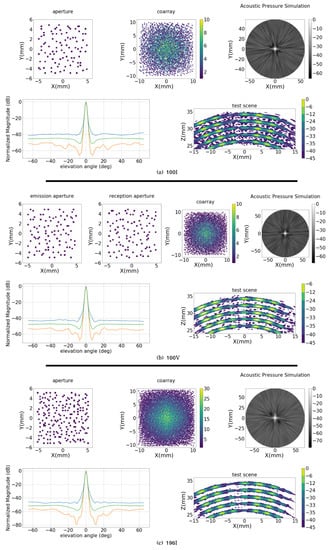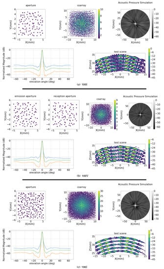 The first one, called 100I, contains 100 elements, operating all in emission and reception. In this case, and , so it is considered an ultrasparse aperture. The aperture is divided in a grid of bins and in each bin ( elements), one element is active.