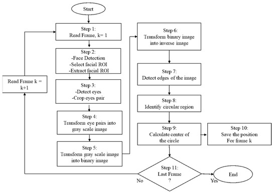Initially, video files are converted into images based on the frame size. In Step 2, the face is detected from the video images through a region of interest (ROI) using the Viola and Jones algorithm [50] and, to speed up the face detection to the next consecutive image frames, face tracking is applied using the Kanade-Lucas-Tomasi (KLT) algorithm [51]. Details and a technical description of face detection are presented in our previous article [52]. Several image processing tasks are conducted to detect eye pupil positions in the image frames. First, the extracted facial ROI is converted into grayscale images and then the grayscale images are transformed into binary images, imposing a threshold value of 0.5. In the next level, the binary image is converted into an inverse image. Inverse image helps to find the edges of the face which are formed due to presence of eyes, nose and mouth. A Sobel edge detection method is used for detecting these edges in the inverse image. Then, the goal is to find the eyes; to do this, it is detected whether there is any circular region or not. Finally two circles for eyes are detected which provide the center of the circle or the center of the eye position. For better understanding, Algorithm 1 is provided with a simplified pseudocode is also provided below:
