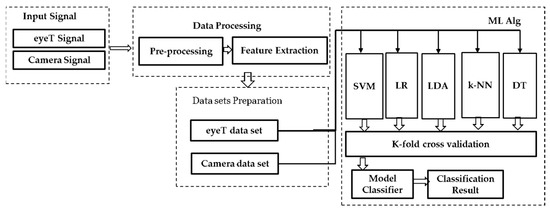 For cognitive load monitoring, different parameters have been investigated through different physiological sensors. From the literature (presented in Section 1.1) it is seen that there are not many vision-based contributions in driver monitoring applications. Though a few attempts (i.e., vision-based methods) have been initiated for driver cognitive load monitoring, these are limited to head movement or behavioral activities. In this paper, a vision-based method is implemented to extract eye movement parameters through a driver’s facial images, which is a new and noble contribution in this domain according to our knowledge. Several machine learning (ML) and deep learning (DL) algorithms are deployed to classify the driver’s cognitive load. Here, a single digital camera is used to record the driver’s facial images, and eye pupil positions from each image frame are detected and extracted. Two eye movement parameters, saccade and fixation, are calculated using the eye pupil positions and 13 features are extracted manually. However, in this study, subject fatigue is not considered for cognitive load classification [11]. Five ML algorithms, support vector machine (SVM) [22], logistic regression (LR) [23], linear discriminant analysis (LDA) [24], k-nearest neighbor (k-NN) [25] and decision tree (DT) [26], are deployed for cognitive load classification. Further, three DL architectures: convolutional neural networks (CNN) [27], long-short-term-memory (LSTM) [28,29] and autoencoder (AE) [30] are designed both for automatic feature extraction from raw eye movement signals and for classification. Additionally, combined DL + ML approaches, i.e., CNN + SVM and AE + SVM, are used for feature extraction and classification. In addition, a commercial eye tracker is simultaneously used as a reference sensor. Finally, the performance of the cognitive load classification is evaluated through several statistical measurements: the accuracy, F1-score, sensitivity and specificity of the camera system are compared with the reference system. To observe the significant difference between the ML and DL algorithms, two statistical significance tests, Wilcoxon’s test and Delong’s test, are conducted. Comparisons between the systems are observed in terms of raw extracted signals, extracted features and different windowing.