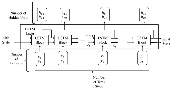 This diagram presents the flow of the time-series data (x,y) with features (channels) C of length S through an LSTM layer. In the diagram, and denote the output or the hidden state and the cell state, respectively.