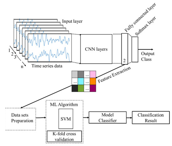 CNN + SVM: A DL + ML approach considering CNN + SVM is presented in Figure 8. The CNN model presented in Figure 8 is used to extract features automatically from the raw data and the features are then used for cognitive load classification using a machine learning classifier.