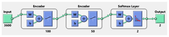 The network of this stacked AE is formed by the two encoders and one softmax layer; however, the second encoder is also called the decoder. The number of hidden units in the first and second encoder is 100 and 50, respectively. In this case, the raw data of size (360 × 3600) are fed into the input layer and then the first encoder is trained. Traditionally, the number of hidden layers should be less than the data size. After training the first AE, the second AE is trained in a similar way. The main difference is that the features that were generated from the first AE will be the training data in the second AE. Additionally, the size of the hidden layers is decreased to 50, so that the encoder in the second AE learns an even smaller representation of the input data. The original vectors in the training data had 3600 dimensions. After passing them through the first encoder, this was reduced to 100 dimensions. After using the second encoder, this was reduced to 50 dimensions. Finally, these 50-dimensional vectors are used to train the SVM model to classify the two classes of cognitive load. K-fold cross-validation approach is considered for the validation.