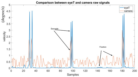 It is observed that the saccade peaks between eyeT and camera signals are identical, and only the amplitude of the fixation of the camera signal is higher than the amplitude of eyeT. This makes it easy for the feature extraction task by the proposed camera system.