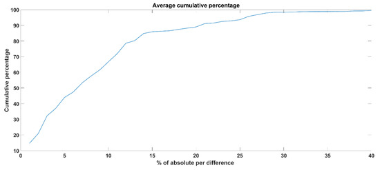 As can be observed from Figure 11, the cumulative percentages of 80, 90 and 100 are achieved for the absolute differences while considering as a threshold, i.e., 13, 20 and 40, respectively. That means to achieve 100% accuracy of the raw signal extracted from the camera system compared to the eyeT system, the absolute differences between the two raw signals should be 40 as an average value of 30 subjects.