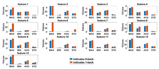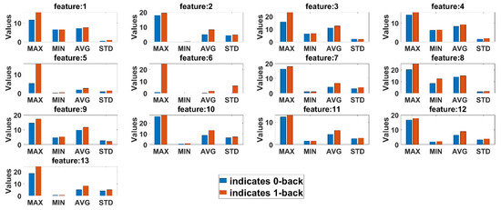Statistical comparison between features extracted from 0-back and 1-back classes are conducted to observe if there are any significant differences in cognitive load with non-cognitive load tasks both for eyeT and camera system. Here, four statistical parameters, maximum (MAX), minimum (MIN), average (AVG) and standard deviation (STD), are calculated for all test subjects. Figure 13 presents the average summary of the statistical measurements for the eyeT system. Figure 14 presents the average summary of the statistical measurements for the camera system.