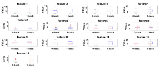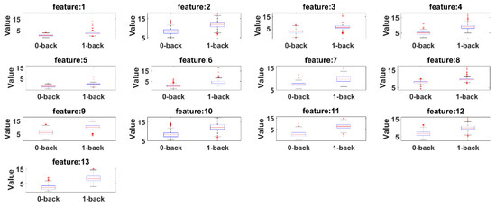 Before conducting classification, three types of statistical analyses have been conducted for saccade and fixation features between eyeT and camera systems using several statistical parameters such as correlation coefficients, MAX, MIN, AVG, STD and boxplot. The 1st experiment is conducted on the comparisons between the features of eyeT and camera systems using correlation coefficients. Here, the closeness of the extracted features between the two systems is observed and presented in Figure 13. The results show that the correlation coefficients for all saccade and fixation features between eyeT and camera range from 0.82 to 0.95, which indicates a strong positive relation between eyeT and camera. The 2nd experiment is conducted to observe if there are any significant differences between the features of 0-back and 1-back cognitive load classes. Here, statistical parameters MAX, MIN, AVG and STD show that there are significant differences between 0-back and 1-back features both for eyeT and camera, as presented in Figure 14 and Figure 15, respectively. Boxplots for all 13 features between 0-back and 1-back also confirmed that there are significant differences considering 1st quantile, 3rd quantile and median values both for eyeT and camera. These boxplots are presented in Figure 16 for eyeT and Figure 17 for the camera.