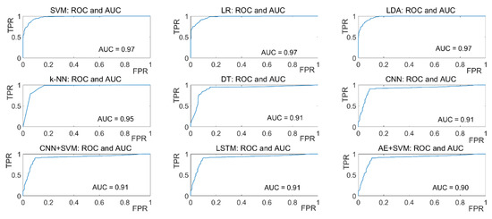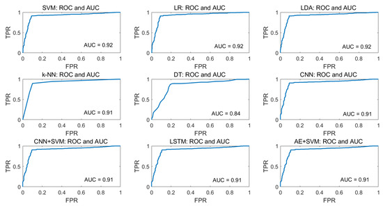 Figure 18 shows that the AUC values for the camera considering SVM, LR and LDA are 0.92 and for k-NN and DT are 0.91 and 0.85, respectively, which indicates that the ROC curves for SVM, LR and LDA show better performance than k-NN and DT.