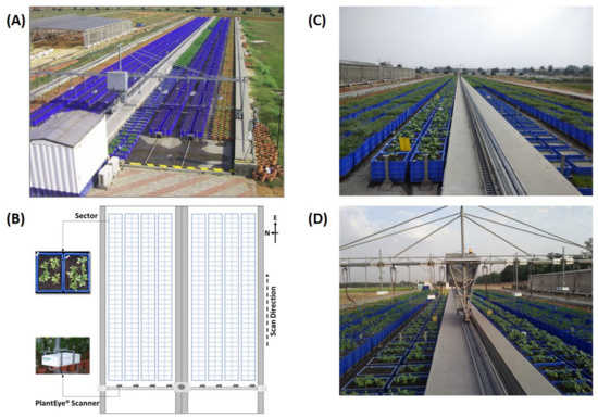 (A) Aerial view of LeasyScan high-throughput plant phenotyping facility at ICRISAT; (B) Layout of the platform showing sectors and PlantEye® laser scanners that generate a digital reflection of plants in the form of 3D point clouds; and (C,D) Mung bean and chickpea genotypes monitored continuously for crop canopy traits.