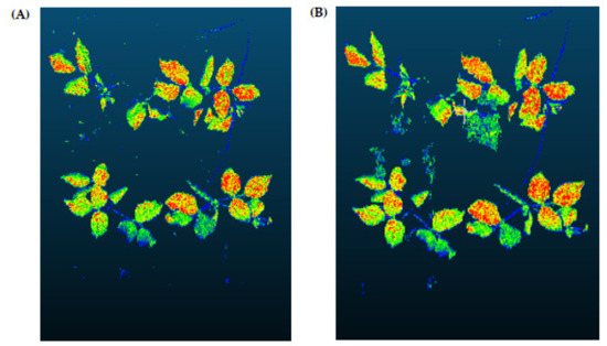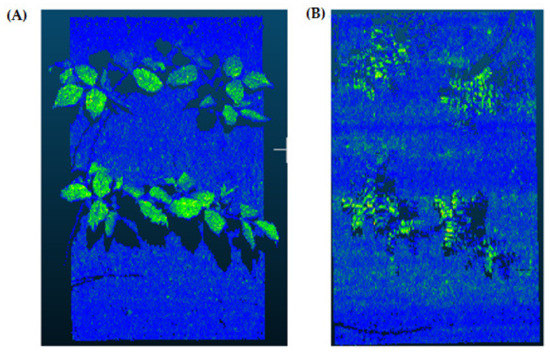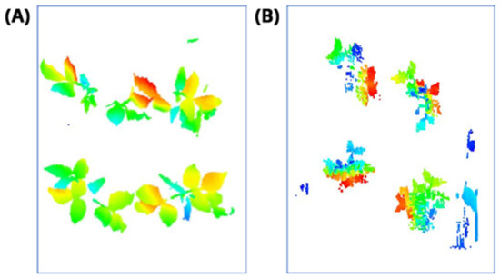 In this step, the pure plant data obtained from the previous step were converted into 2D images. The purpose of rasterization into 2D format was well described in the Introduction and Discussion sections. Before the rasterization process, a Statistical Outlier Removal (SOR) algorithm was applied to filter out the noisy data (outlier) [39] . Then, the projections of the data points on the two-dimensional x- and y-planes were calculated. The only color information value that the data set contains is “intensity”, which is the intensity of the laser reflection received by the camera. However, the laser does not have the same color quality as a regular light source. The reflection can be very diffuse, hence its biological use is always questionable. Therefore, each pixel was colored according to the height gradient of the relevant point-cloud data. When the rasterized images in Figure 8 were examined, it can be seen that relatively meaningful images have been formed using the height value.