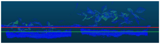 A partial view of a sample raw data with two soil separation lines. The red line points to the selected fixed height coordinate to separate the whole soil data, while the green line points to the other coordinate to keep as much plant data as possible. In the case of using the coordinate value pointed with the red line, it is seen that many plant data belonging to the left tray is lost. On the other hand, if the green line points to the coordinate, many soil data belonging to the correct tray cannot be cleared.