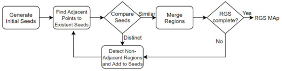 The objective of the RGS is to merge points that are close enough to each other in terms of their smoothness value. The work of the algorithm is based on the comparison of angles between the normal points. Clusters of points that are considered to be part of the same smooth surface are produced as output from the algorithm. First, the normal of each point was calculated based on other points around it. Second, all points are sorted by their curvature value. Then, the algorithm accepted the points with small curvature values as initial seed points and started the region’s growth. The flowchart of the RGS algorithm [37] is shown in Figure 5.