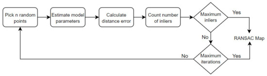 The RANSAC model was used to estimate the parameters of a mathematical model from a data set. The algorithm assumes that the dataset we are working with contains both inliers and outliers. The data that fit the specified model are called inliers, while the data that do not fit are called outliers. RANSAC randomly samples a subset of points at each iteration. The selected subset is considered to be inliers, and this hypothesis was tested in every iteration. The flow chart of the RANSAC algorithm is given in Figure 7 [38].