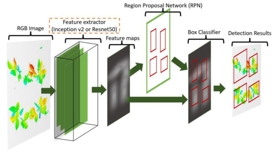 In this study, Faster RCNN architecture combined with two modern feature extractors (Inception-v2 and Resnet50) to construct two different plant detection algorithms. In-ception-v1 (GoogleNet), the winner of the ImageNet Large-Scale Image Recognition Competition 2014 (ILSVRC14), was proposed by Google in 2014. The layout of the Inception-v2 network (number of convolutions, pooling, and inception modules and their order) can be found in [41]. Similarly, ResNet architecture was the winner of the ILSVRC15, which was proposed by the Microsoft Research team in 2015. The 50-layer Resnet, namely ResNet50, was utilized as the feature extractor in this study.