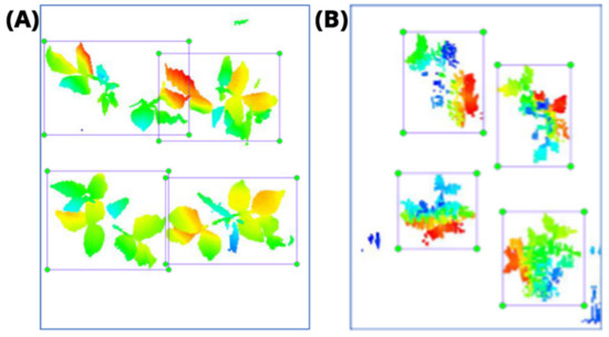 Therefore, to achieve the objectives of this study under the current state of CNN models development, the 3D data were converted to 2D projections, which also substantially simplified the computational requirements by reducing the data size from 3D (width X length X height) to 2D (width X length). It is important to note that height was added to these 2D projections as color (see Section 2.5), which added valuable information and enabled CNN models to better learn plant patterns (the lower large leaves are blue, the upper small leaves are red; see Figure 8). Moreover, the conversion to 2D delivers a “true” projection instead of a skewed projection with conventional 2D imaging devices where the object’s distance to the scanner will skew the actual plant area it captures. In the future, 3D to 2D projections can be generated from different angles and can be fed to standard 2D CNN pipelines. In addition, laser-line scanning technology can be more easily automated in such big systems compared to 2D imaging systems.