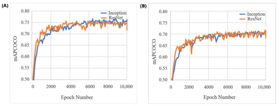 mAPCOCO scores of the Inception-v2 and the ResNet50 models on mung bean (A) and chickpea (B) validation dataset during the training process.
