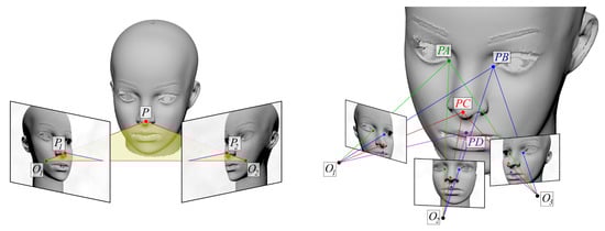 The principle of photogrammetry is essentially stereoscopic vision, i.e., reconstructing 3D coordinates of points from two or more 2D images. Every point of a 2D photograph represents a 3D point situated on a straight ray starting at the lens and pointed in a direction determined by the 2D coordinates. Its location along the ray is unknown, due to the loss of information in 3D-to-2D projection. Adding another photograph taken from a different viewpoint adds another ray and determines the 3D point as the intersection of the two rays (the left part of Figure 1). Applying this approach requires the position (location and orientation) of the cameras to be known, as well as their projection matrices relating 3D points in camera-centred coordinates to their projections in the image. All of those are determined during calibration. Formulas for stereoscopic 3D calibration and reconstruction can be found in [38,39,40].