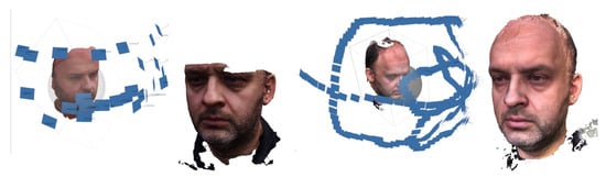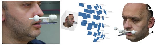 Images were taken of a highly motivated adult subject, distinguished by patience and the ability to stay motionless (Figure 2). In this and some subsequent figures, small blue rectangles suspended in 3D space represent the camera positions. To evaluate the accuracy of the embedding method described in Section 2.4, an additional scan was performed of the face with the facial bow (Figure 3).