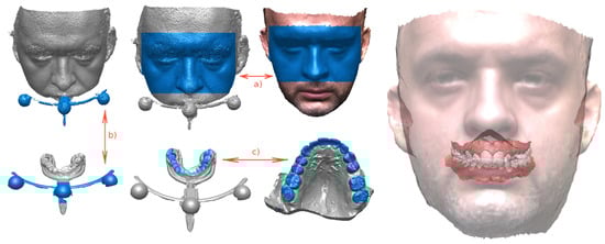 The method [20] uses a facial bow to create a link between the internal and external geometry of the patient’s face. The following scans—or photogrammetric reconstructions—are used: of the face at rest; of dental models; of the face with facial bow inserted; and of dental models with the facial bow.
