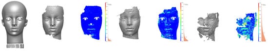 To estimate the different components of the distance, each pair of corresponding models was also aligned directly, with the use of the ICP algorithm, bringing the two models of the same object as close as possible, without considering any other parts. The error of this alignment, i.e., the difference between the two meshes, is as an estimate of the discrepancy between the different imaging techniques: scanning and photogrammetry. They are presented in Figure 10, Figure 11, Figure 12 and Figure 13 and Columns 2 and 3 of Table 6.