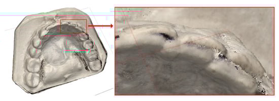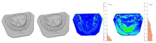 Integrating the photographs from multiple rotary-table sessions under Agisoft proved problematic (Section 4). Only the relevant part of the dental cast was used, i.e., the model of the teeth, rejecting the flat undersides, which were extensively used for registration in previous work [52]. The model of the teeth was therefore aligned with a negative of the occlusal portion.