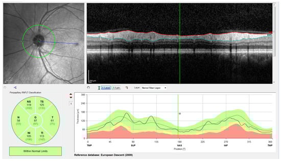 Screenshot provided by the Spectralis software version 6.9.4.0. From left to right and top to bottom: Retinal fundus photography centered on the optic disc (the yellow circle indicates the location of the peripapillary B-scan, which is shown on the right with the segmentation of the RNFL); 2D peripapillary B-scan OCT on Cartesian coordinates; estimated mean values for RNFL layer thickness for the temporal (T), temporal superior (TS), nasal superior (NS), nasal (N), nasal inferior (NI), and temporal inferior (TI) sectors, as well as the overall mean (G); rectified outline of the RNFL with estimated thickness and reference values according to the database European Descent (2009).