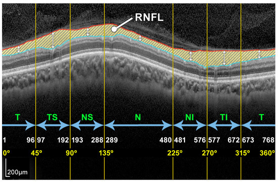 Example of a peripapillary B-scan OCT image with the manual segmentation of the layer of interest RNFL and description of the sectors: T, TS, NS, N, NI, and TI.
