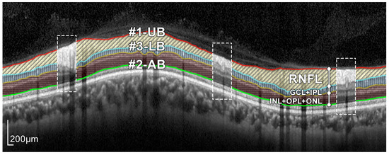 Layers of the retina from top to bottom. RNFL: retinal nerve fiber layer; GCL: ganglion cell layer; IPL: inner plexiform layer; INL: inner nuclear layer; OPL: outer plexiform layer; and ONL: outer nuclear layer. Boundary delineation in the segmentation process. #1-UB: upper boundary of the RNFL; #2-AB: auxiliary boundary corresponding to the lower boundary of the ONL; #3-LB, lower boundary of the RNFL. The dashed boxes exemplify some of the artifacts of the layers.