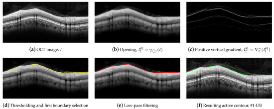 The upper boundary of the RNFL, #1-UB, was outlined first, taking advantage of the high-contrast level between this layer and the upper area of the image. However, morphological preprocessing and the subsequent approximation with active contours are necessary in order to minimize the artifacts present in a large number of OCT images of the database. Section 2.5 describes this process in detail.