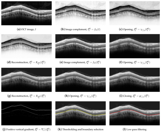 Dark details smaller than were eliminated first. This implies the application of the following morphological operators. Initially, we took the complement of the OCT image I,