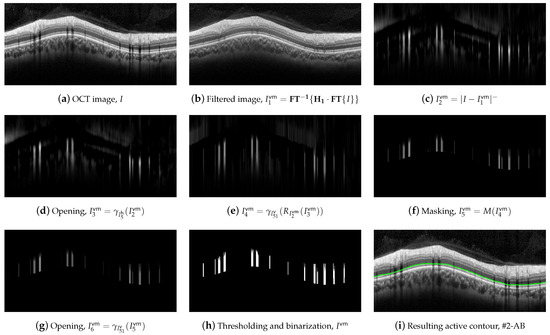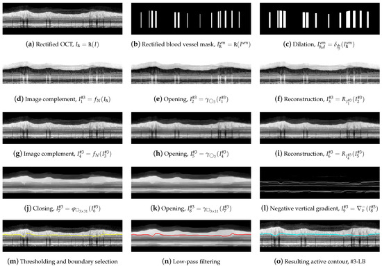 which is depicted in Figure 8h,i. As can be observed, the application of these morphological operators led to the removal of all artifacts from the ONL layer, and a clear definition of the lower margin of the ONL layer, which is used as the boundary #2-AB. In order to contour this boundary, the positive vertical gradient defined in Equation (5) was calculated,