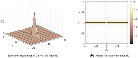 where the superscript stands for blood vessel mask and represents the transfer function, namely the two-dimensional discrete Fourier transform of the point spread function of the filter . Figure 11 depicts both the point spread function and its transfer function . This filter has low-pass and all-pass behavior in the horizontal and vertical directions, respectively. This behavior can be noticed observing the two dark horizontal bars located at the vertical frequency with a bright gap between them located at the frequencies . This leads to the preservation of all parts of the image except those with variation in horizontal direction, that is , which is removed from the image [68]. Note that the shadows cast by blood vessels are vertical edges, i.e., areas with nonzero horizontal variation, being therefore removed by the filter. Thus, this filter leads to a reduction of the shading effect of the vessels while maintaining the horizontal edges of the image which delimit the layers of interest, as can be seen in Figure 10b.
