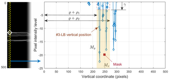 Selection of the #2-AB vertical position. On the left, the positive vertical gradient image . On the right, 1D profile of the dashed column of .