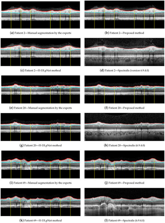 An important distinguishing feature between the proposed method and the H-DLpNet method is the ability to apply constraints in the segmentation process. In the H-DLpNet method, a training is first performed with a set of labeled images, and then the convolutional neural network is applied to automatically predict the segmentation in the target images. By contrast, the proposed method can directly operate on the images in the database, being able to impose certain restrictions in the segmentation process, such as grey levels of the layers, minimum and maximum thicknesses, periodicity, smoothness or maximum curvature, and layer continuity, among others. The application of these constraints is more challenging in neural-network-based methods and allows for greater robustness in layer detection. In particular, the H-DLpNet method has problems in the segmentation of seven images of the database, which are instead correctly segmented with the proposed method.