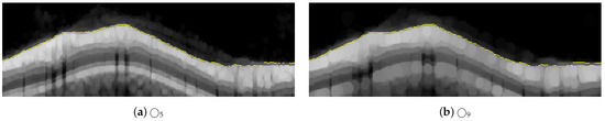 In order to minimize these artifacts, an active contour approach was then applied. We first smoothed the detected points by applying a low-pass filtering with a sliding window with width pixels [67]. The smoothed contour, which is shown in Figure 7e, was used as the initialization of the deformable model. An active contour was then applied using the parameters , , , , B-splines as shape function, and the image as source for the external forces calculation. Figure 7f depicts the resulting contour, which fits the upper boundary of the RNFL.