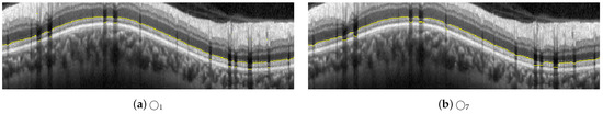 where I stands for the OCT image to be segmented. As can be seen, the small bright elements of Figure 7a are suppressed in Figure 7b. In addition, most of the speckle noise above the RNFL was significantly reduced.