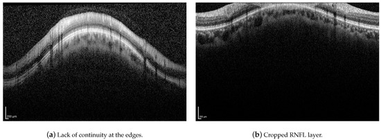 Although the proposed method has proven to be robust to image artifacts produced by vessels shadowing and speckle noise of usual practical scenarios (variance less than 0.1), some issues may hinder the correct segmentation of the RNFL. Neither the proposed method nor the H-DLpNet method do not provide satisfactory results in four images of the dataset, in which the retinal layers suffer from the lack of continuity at the edges of the image or where part of the RNFL is cut off in the image area, as exemplified in Figure 19. It should be noted, however, that in clinical practice, the expert repeats the acquisition of such images, as they are considered invalid.