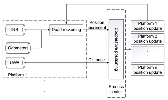 In this paper, a hierarchical cooperative positioning algorithm is used. The algorithm structure is shown in Figure 1. Inertial Navigation System/Odometer (INS/OD) integrated navigation is adopted for single platform [35] to carry out dead reckoning, and the obtained position information is transmitted to the processing center according to a certain frequency for interactive fusion. After receiving the position information of each platform, the cooperative positioning processing center uses the distance information to correct the position of each platform. Finally, the processing center transmits the corrected position information to each platform to complete the whole cooperative positioning process. The filtering model of cooperative positioning refers to the model adopted in reference [9].