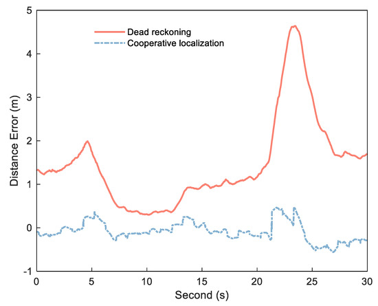 Distance error of cooperative positioning (red solid) and dead reckoning (bule dashed).