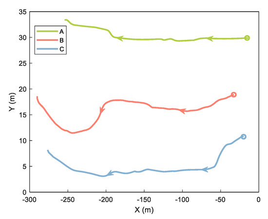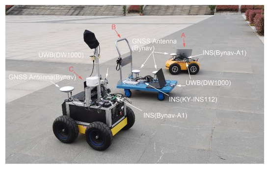 In the cooperative positioning experiment, we used three mobile platforms called A, B, and C. Platforms A and C are robots equipped with odometer, INS, GNSS, and UWB. Platform B is a trolley equipped with INS, GNSS, and UWB. In this experiment, we analyzed the ranging error and verified the proposed method of handling the ranging error. The experimental equipment is shown and labeled in Figure 6. The GNSS base station was placed on the roof of a nearby building about 200 m away. Both cars have built–in odometers. The tracks of the three platforms are shown in Figure 7, with circles representing the starting position and arrows representing the direction of movement.