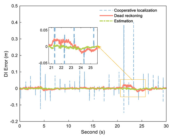 DI error of cooperative positioning (blue dashed), dead reckoning (orange solid), and estimation (green dashdotted).