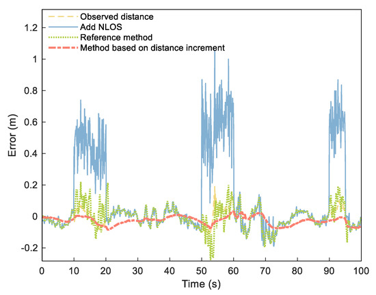 Since it is impossible to obtain accurate distribution of NLOS error in actual environments, our simulation experiment simulated the NLOS error by adding a group of numbers that obey normal distribution to the measured data according to literature [38]. We added a set of numbers distributed as (NLOS1), (NLOS2), and (NLOS3) to the measured distances of 10–20, 50–60, and 90–95 s to simulate the NLOS error. According to our proposed process, we set threshold to 45 cm (three times of ranging error) and set the estimated duration M of NLOS as 3 s. We analyzed the distance error and NLOS estimation time after processing and compared them to the UWB ranging error estimation and compensation methods [2] as a reference method. For ease of description, we call the reference method RN–Based and the DI method DI–Based.