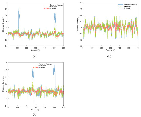 Distance errors of the observed distance (blue solid), RN–Based distance (green dashed), and DI–Based distance (orange dashdotted) over different segments: (a) A–B, (b) B–C, and (c) A–C.