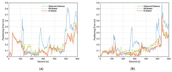 Obtained positioning errors of (a) Platform A and (b) Platform C using observed distance (blue solid), RN–Based distance (green dashed), and DI–Based distance (orange dashdotted).