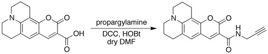 Coumarin343 (142.4 mg, 0.50 mmol), propargylamine (117.1 mg, 2.13 mmol), and 1-hydroxybenzotriazole (HOBt; 107.0 mg, 0.79 mmol) were placed in a test tube and dissolved with dry DMF (2 mL). Then, a solution of DCC (207.5 mg, 1.01 mmol) in dry DMF (1 mL) was added to the solution, and the mixture was stirred at room temperature for 72 h. After removing the solvent, the crude product was purified by preparative GPC to afford C343-pa (55.6 mg, 0.17 mmol) as shown in
