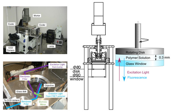 r = 40 mm). The rotating disk was moved upwards by 0.3 mm from the point of contact with the glass surface to make the gap. The rotating disk was rotated by a motor (NX940AS-PS5-1, Oriental Motor, Tokyo, Japan) to apply shear to the polymer solution. When the polymer solution was sheared, heat was generated due to viscous dissipation and friction, and the temperature of the solution would increase. To maintain the temperature, a cooling system (FPH1-12708AC, Z-Max, Tokyo, Japan) was installed, and the temperature of the polymer solution was controlled to 295 K. Since toluene, which was the solvent used for the polymer solution, is volatile, a solvent trap with a phosphate buffer solution was installed. The rotating disk was operated for 2 h before the measurements to ensure that the measurement was carried out with the toluene vapor saturated. The fluorescence images were taken every minute with an exposure time of 60 s, starting from the actuation of the rotating disk.