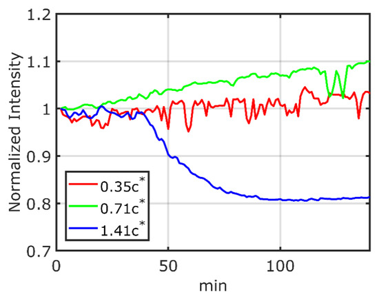 polymer solution, the fluorescence intensity tends to decrease with time. These changes in the fluorescence intensity can be attributed to the change in FRET efficiency, that is, it can be interpreted as the change in the end-to-end distance of the FRET molecules in the polymer solution. Lower intensity indicates compression, and higher intensity indicates elongation. Therefore, when a shear force is applied, the FRET molecules are observed to elongate or compress, depending on the concentration of the polymer solution. However, since there is ambiguity in the value of the critical overlap concentration