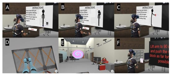 A representation of Virtual Reality Berg-Balance Scale ((VR-BBS) A,D) Narrow stance, the instructions read: Please stand with your feet together, following the footprints on the flow once you begin. Do not use the chair for support. ((task 4 in VR and task 7 in the standard BBS, see Table 1), B,E) Turning to look behind over left and right shoulder while standing. The instructions read: A target will appear behind you. Without moving your feet, turn to look directly at the target to the left until it disappears. Then repeat to the right. ((VR-BBS task 6 standard BBS task 10) and C,F) Reaching forward with outstretched arm while standing. The instructions read: Please reset your stance to normal. Then use one arm to slide the square as far forward as you can without taking a step. ((VR-BBS task 5 standard BBS task 9).