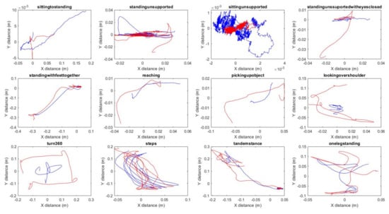 Task data of one of the subjects completing the VR-BBS, the blue line represents the COM and the red line the HTC Vive tracker trajectory.